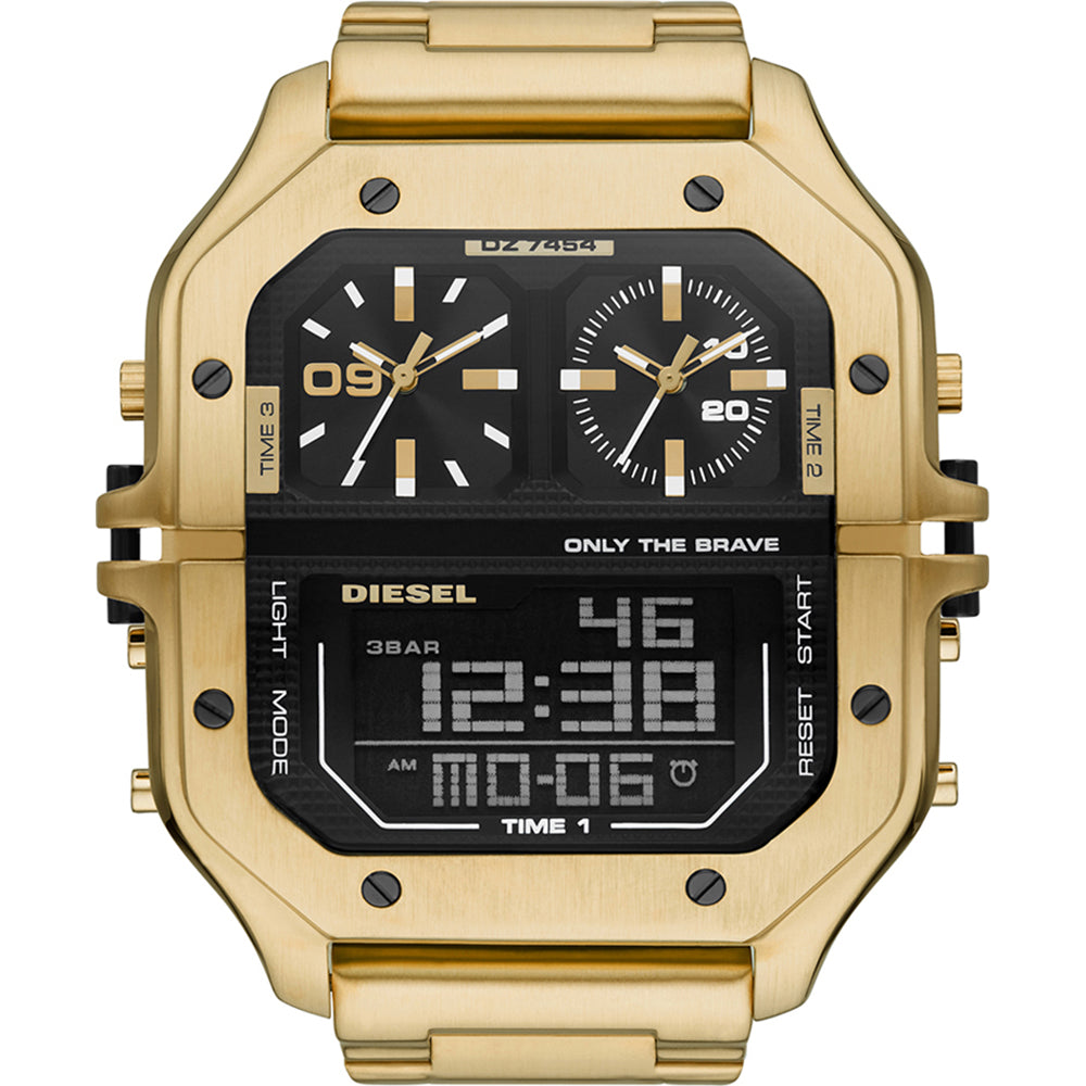 O Relógio Diesel DZ7454 pertence à coleção Clasher, que é conhecida por seu design ousado e contemporâneo. Este modelo destaca-se por sua caixa e pulseira em aço inoxidável dourado, conferindo sofisticação e modernidade. Com esse relógio você vai poder acompanhar 3 fusos horários ao mesmo tempo. O mostrador preto texturizado e o movimento ana-digi oferecem funcionalidades como cronógrafo, calendário e alarme. Com uma caixa de 56mm, o DZ7454 é robusto e possui resistência à água de 3ATM (30 metros). 2 anos de garantia internacional.
