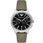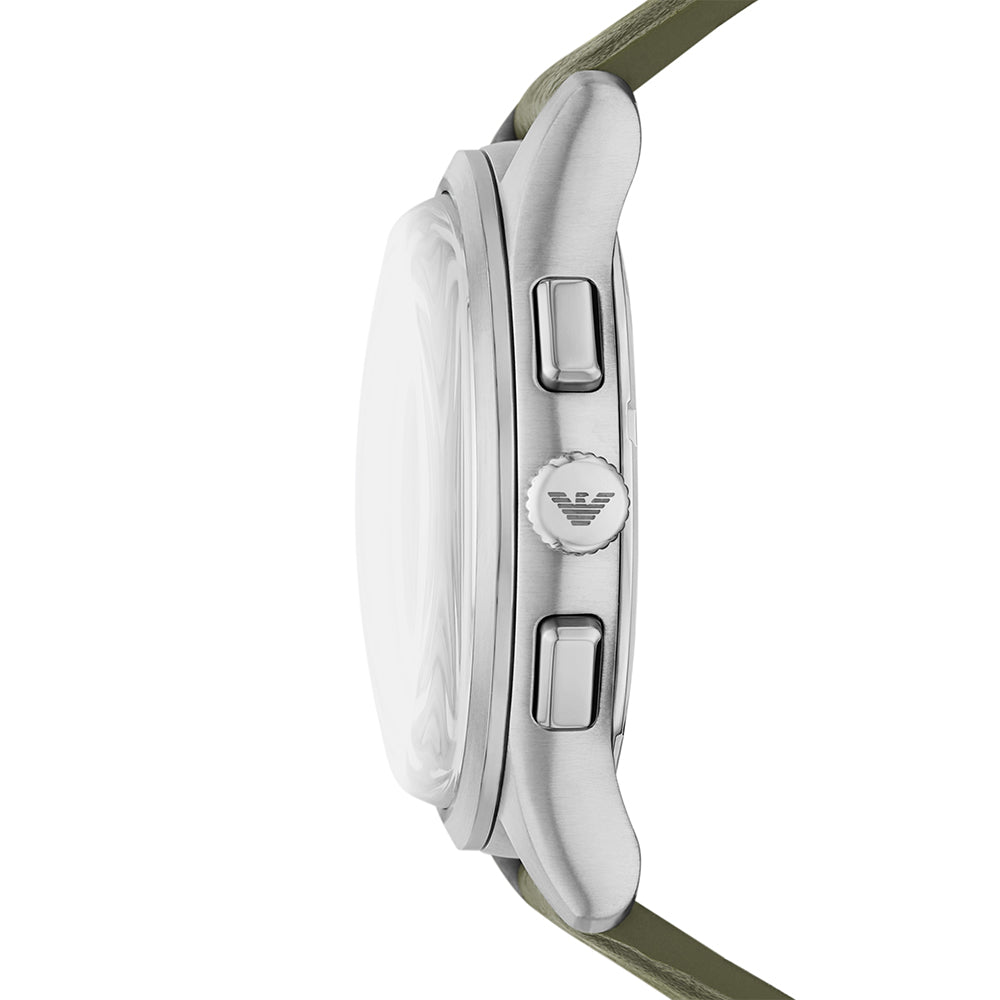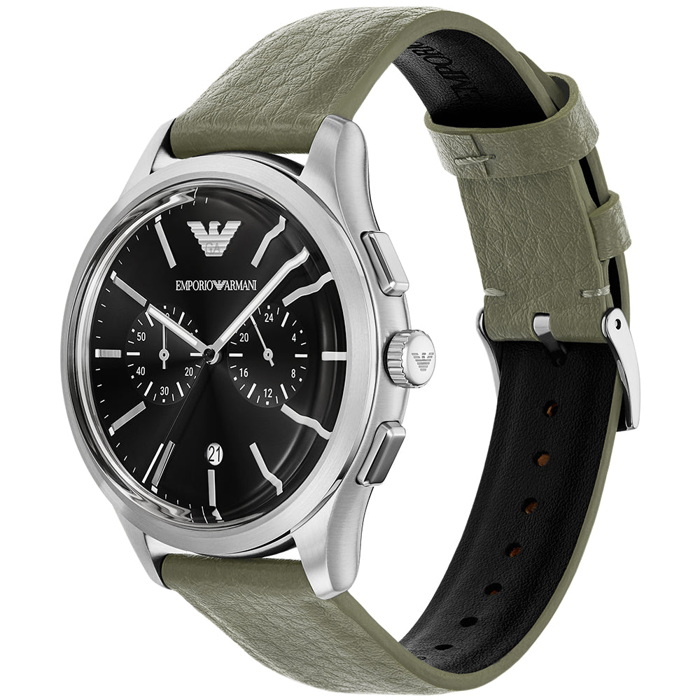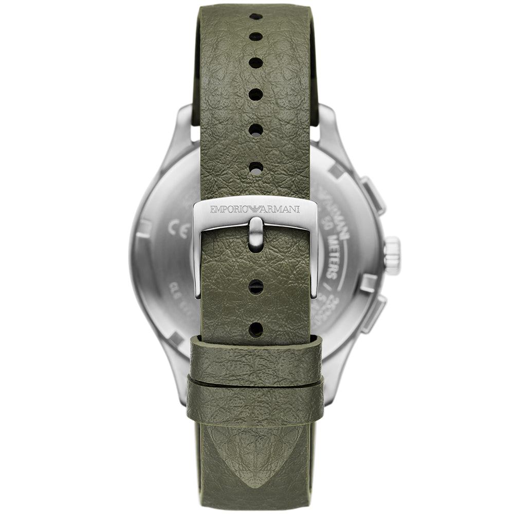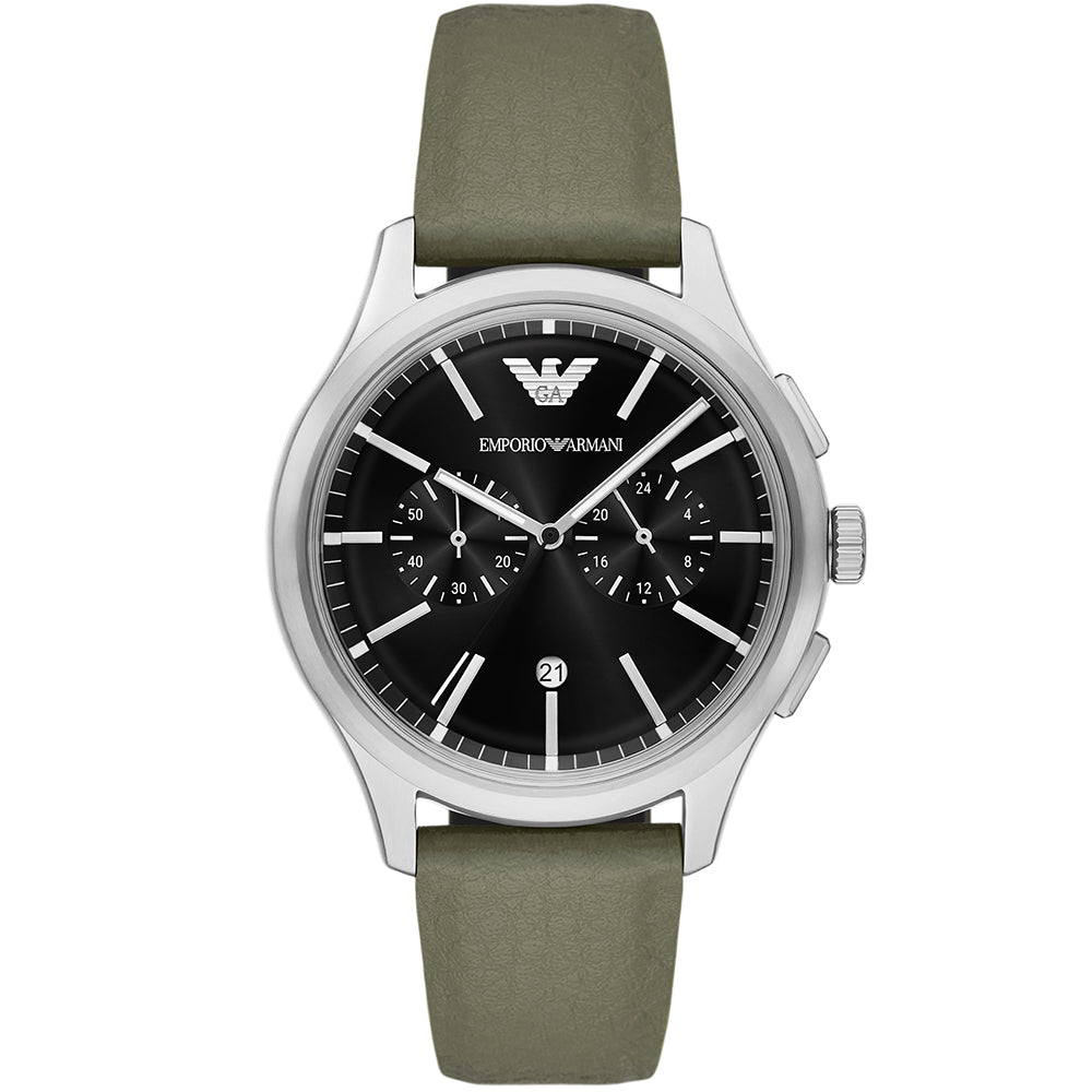 Relógio Emporio Armani AR11693: Parte da linha Dario, com caixa em aço inoxidável prata e pulseira de couro verde, garantindo durabilidade e um visual sofisticado. O mostrador preto é protegido por cristal mineral resistente a arranhões. Com um design elegante e atemporal, a caixa mede 42 mm de diâmetro e 11 mm de espessura. Funcionalidades incluem cronógrafo, exibição de data e resistência à água até 50 metros, adequando-se a uso diário e atividades leves em contato com água. Ideal para quem busca elegância e modernidade. 2 anos de garantia internacional.