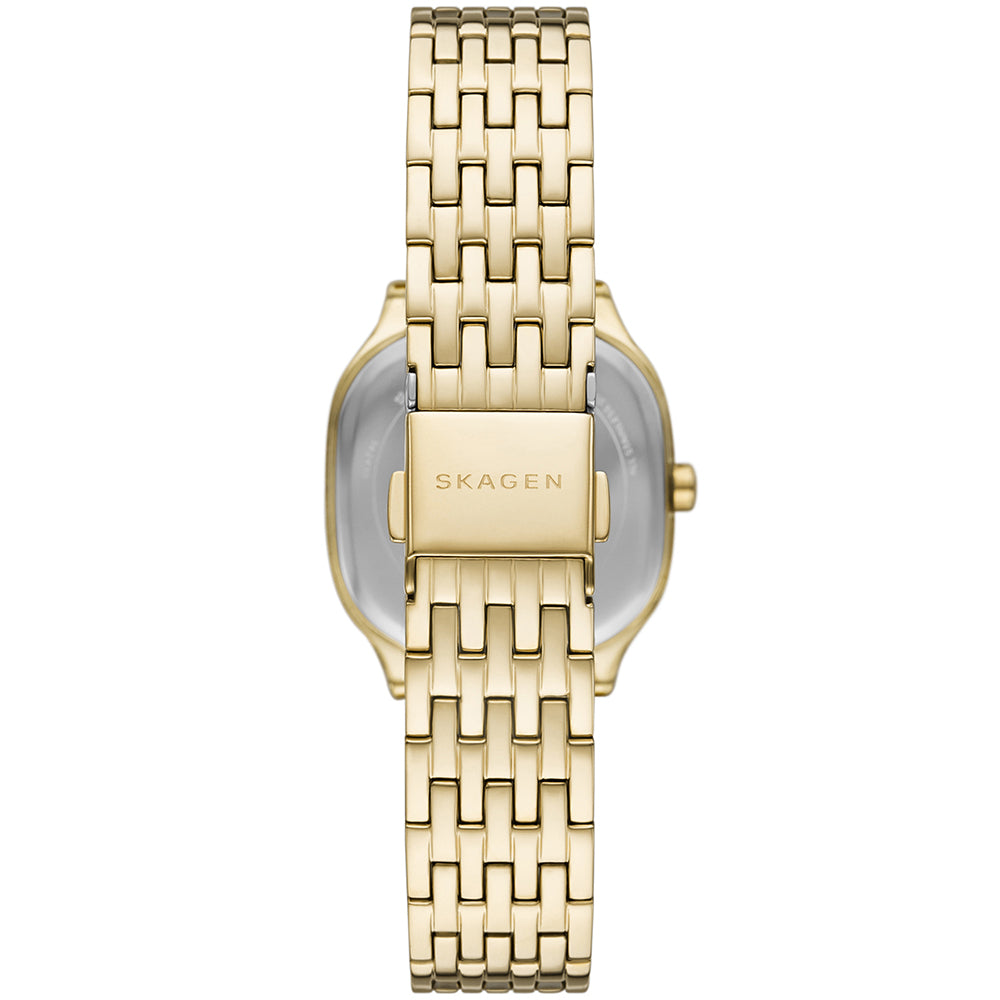 O relógio Skagen SKW3162 integra a linha Mellem. Com uma estética clean, sua caixa de 28mm é confeccionada em aço inoxidável dourado. A pulseira de aço inoxidável dourado, adiciona sofisticação ao design. O mostrador, protegido por cristal mineral, apresenta índices lineares em tom dourado. Equipado com mecanismo de quartzo, este modelo oferece resistência à água de até 3 ATM e 2 anos de garantia internacional. Skagen: A essência do design dinamarquês em cada relógio. Minimalismo elegante, materiais de alta qualidade e uma conexão com a natureza escandinava. Descubra a beleza da simplicidade e adicione um toque de sofisticação contemporânea ao seu estilo
